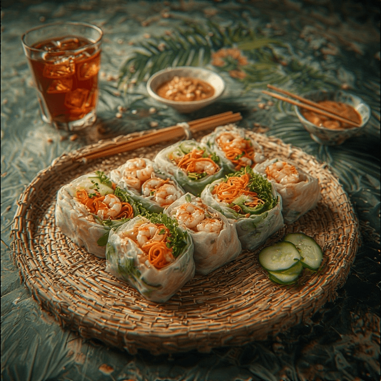 Soak rice paper in warm water, then fill with cooked shrimp, shredded cucumber, carrots, and cilantro. Roll tightly and serve with a peanut dipping sauce for a nutty kick.