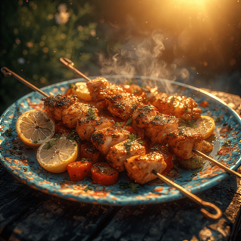 How to Make: Marinate chicken in lemon and herbs, skewer, and grill for 8 minutes. Serve with veggies.