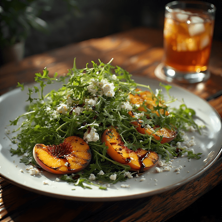Sweet grilled peaches pair with peppery arugula for a refreshing salad. Ready in 15 minutes, it’s perfect for hot evenings. Peaches are at their peak in summer.