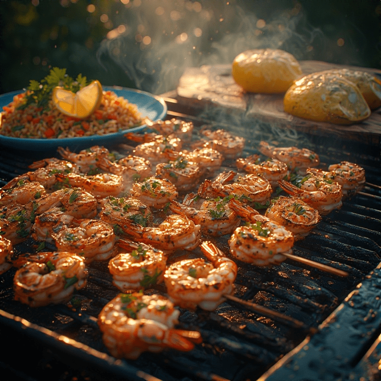 How to Make: Marinate shrimp in lemon juice, garlic, and olive oil for 5 minutes. Skewer and grill 2-3 minutes per side. Serve with rice.