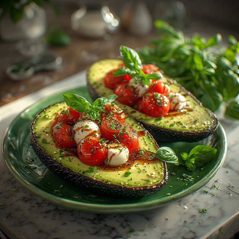 How to Make: Halve avocados, fill with cherry tomatoes, mozzarella balls, and basil. Drizzle with balsamic.