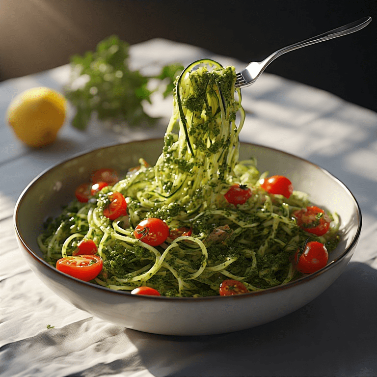 Zoodles with homemade pesto are light and ready in 15 minutes. Zucchini is low-calorie, at 33 calories per cup.