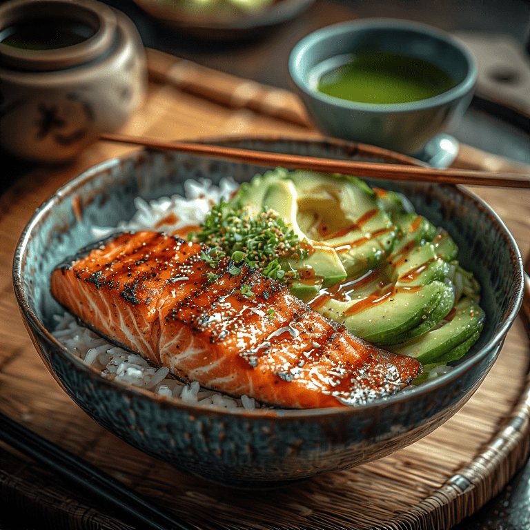 How to Make: Sear salmon with teriyaki sauce, serve over rice with avocado and cucumber.