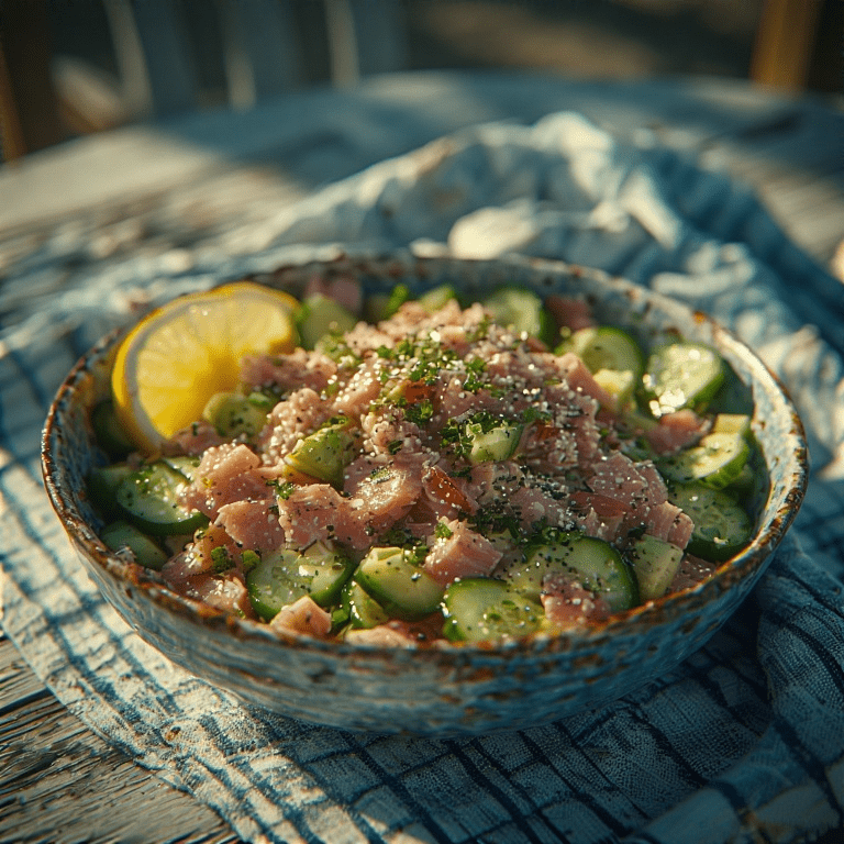How to Make: Mix tuna, avocado, cucumber, and lemon dressing.