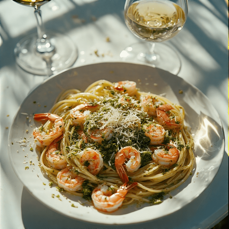 How to Make: Cook pasta, toss with shrimp and pesto.
