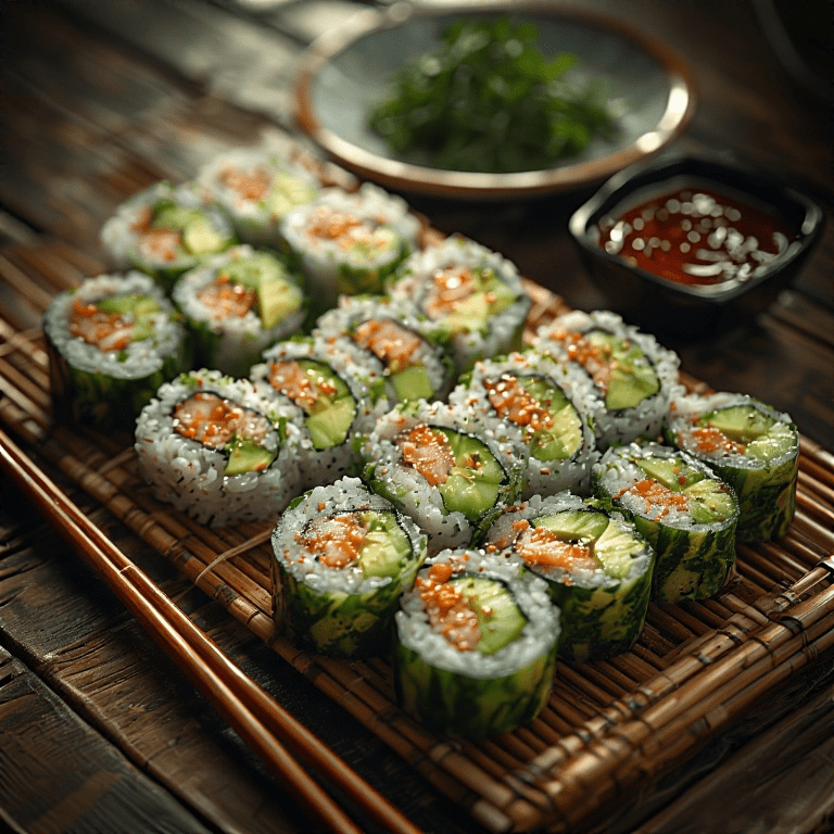 How to Make: Roll cucumber, avocado, and rice in nori. Slice and serve with soy sauce.